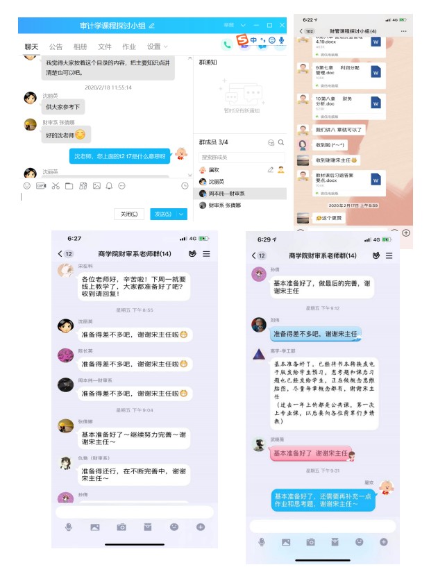 自2月12日接到教务处线上教学具体安排以来,我系高度重视,宋在科主任立即组织制定了《财务与审计系疫情防控期间教学工作预案》、摸排本系承担的授课任务、要求以课程组为单位建立线上交流平台,方便老师交流经验,同时便于掌握各位老师的备课情况。“把课堂搬到线上”,是所有老师的共识,但如何“搬”?课程内容的设计、学生的组织、教学效果的监督等等都是需要慎重考虑的问题。在短短十天左右的时间里,面对大量的操作教程和应用软件,老师们既要边学边用,还要建设起一门门课程并非易事。为了提高效率,老师们通过微信群、qq群进行了热烈的讨论与交流,有人分享好用的软件、有人分享课程资源、有人分享平台操作技巧,大家都在为了同样一个目标而努力着。系里教学经验丰富的老教师比如张传明教授、沈丽英副教授等年纪较长,对电脑操作并不熟练,面对线上教学这样一个全新的形式,却没有退缩,积极主动的与青年教师探讨,学习如何建课、如何录屏,起到了坚定的模范带头作用。