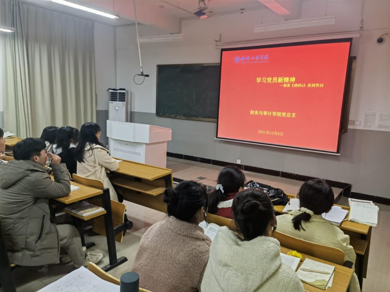 2021年12月8日晚,财务与审计学院党总支组织观看中央组织部和中央广播电视总台联合录制的《榜样6》(建党100周年特别节目)视频。学院党总支副书记李松和、院长宋在科、副院长毛志忠及全体党员通过集中收看和自主学习相结合方式观看节目。