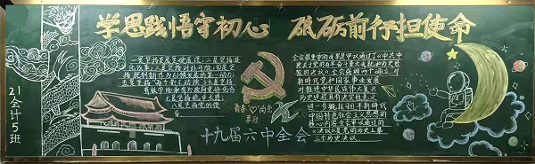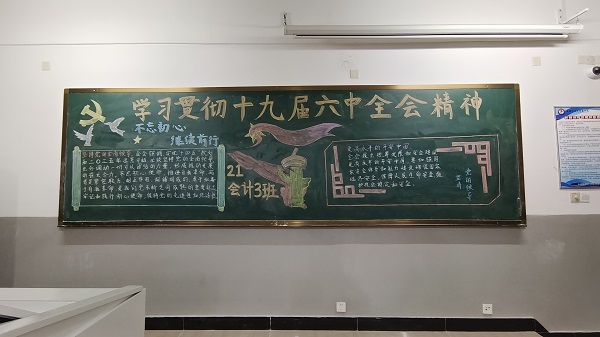为学习贯彻党的十九届六中全会精神,11月25日会计学院组织开展“十九届六中全会精神”主题黑板报活动,利用班级宣传阵地以黑板报形式进行宣传和学习“十九届六中全会精神”。