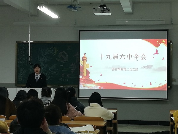 为深入学习贯彻“党的十九届六中全会”精神,推动全会精神深入人心,引导广大群众增强“四个意识”、坚定“四个自信”、做到“两个维护”,更好用全会精神统一思想、凝聚共识、坚定信心、增强斗志。蚌埠工商学院会计学院党总支于11月29号晚开展“党的十九届六中全会精神”专题宣讲活动,由学生第二党支部组织委员程莺,宣传委员胡凤朗以及第二党小组成员牵头举办了学习“党的十九届六中全会精神”宣讲会,活动在格物楼B栋会计学院自习室举行。