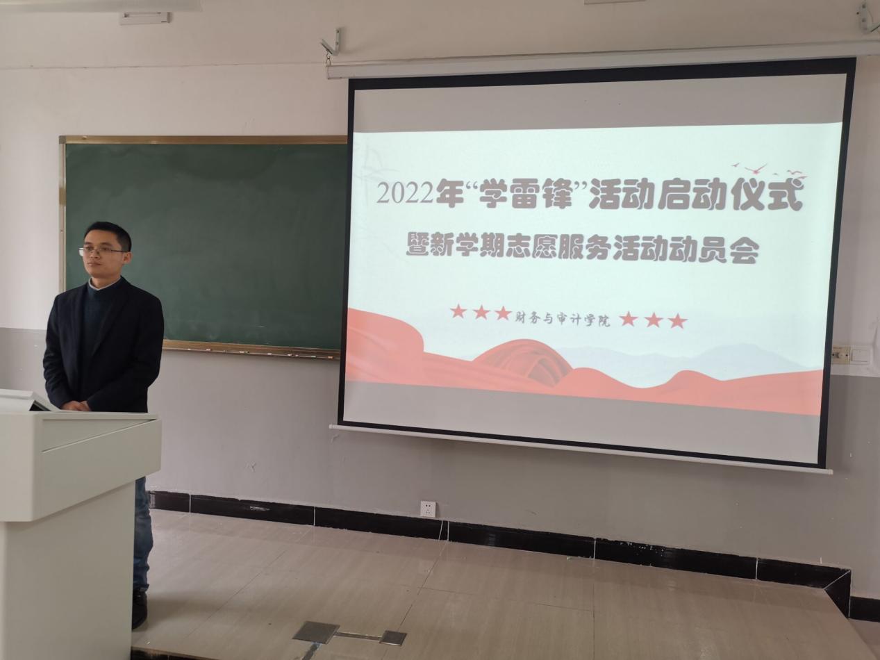 为深入贯彻习近平总书记关于传承和弘扬雷锋精神的重要指示精神,弘扬“奉献、友爱、互助、进步”的志愿服务精神,在第59个“学雷锋纪念日”和第23个“中国青年志愿者服务日”到来之际,财务与审计学院在明理楼C203教室召开2022年“学雷锋”活动启动仪式暨新学期志愿服务活动动员会,全院学生干部及学生代表参加会议,启动仪式由学院团委书记何程林主持。