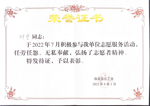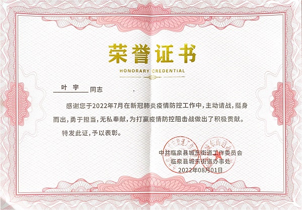 在叶宇和大家的努力下,他所在的社区暑假期间疫情整体平稳。志愿者工作结束后,由于工作认真负责,叶宇同学还被各个被各个部门表彰。