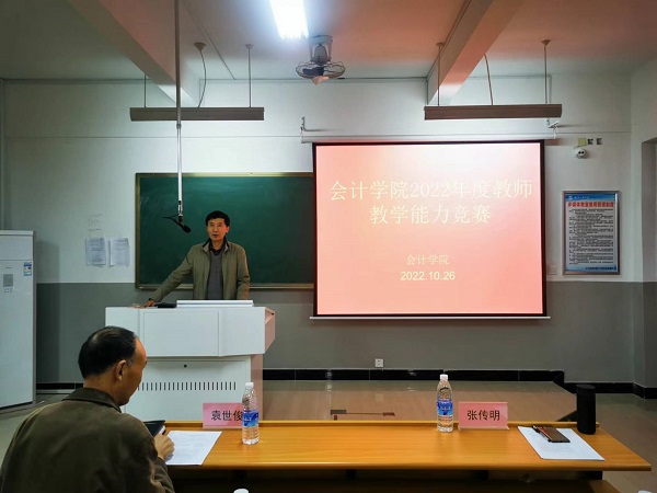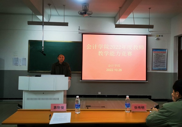为深入贯彻党的二十大精神,落实立德树人根本任务,助力青年教师专业成长,推进省级一流专业建设,会计学院于10月26日在明理楼B301举办第一届教师教学能力竞赛。比赛特邀教务处处长袁世俊、会计学院院长张传明、财务会计系主任叶方同、管理会计系主任孙明及外聘专家李宏教授担任评委。本次比赛共选拔推荐6名青年教师参赛,副院长胡晓平主持,全体教师参加观摩学习。