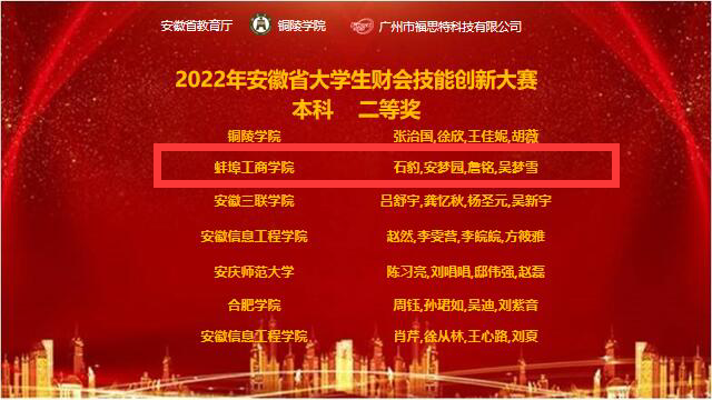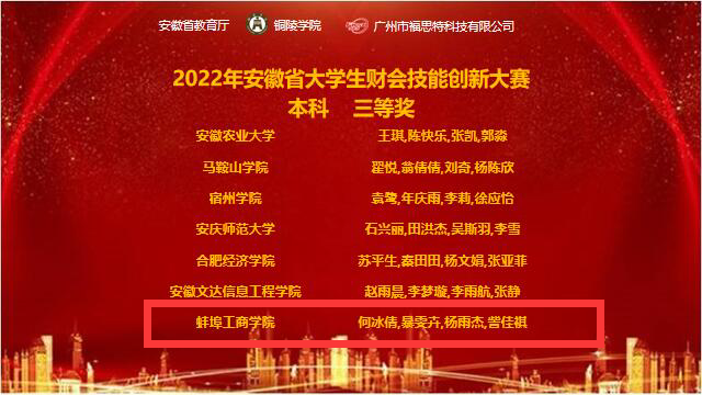 2022年11月26日,由安徽省教育厅主办,铜陵学院承办的2022年安徽省大学生财会技能创新大赛圆满落下帷幕。由我校仇艳、张倩娜老师指导的石豹、詹铭、安梦园、吴梦雪四名学生获得省级二等奖,由孙倩、张婧卓老师指导的何冰倩、訾佳祺、杨雨杰、暴雯卉四名学生获得省级三等奖。