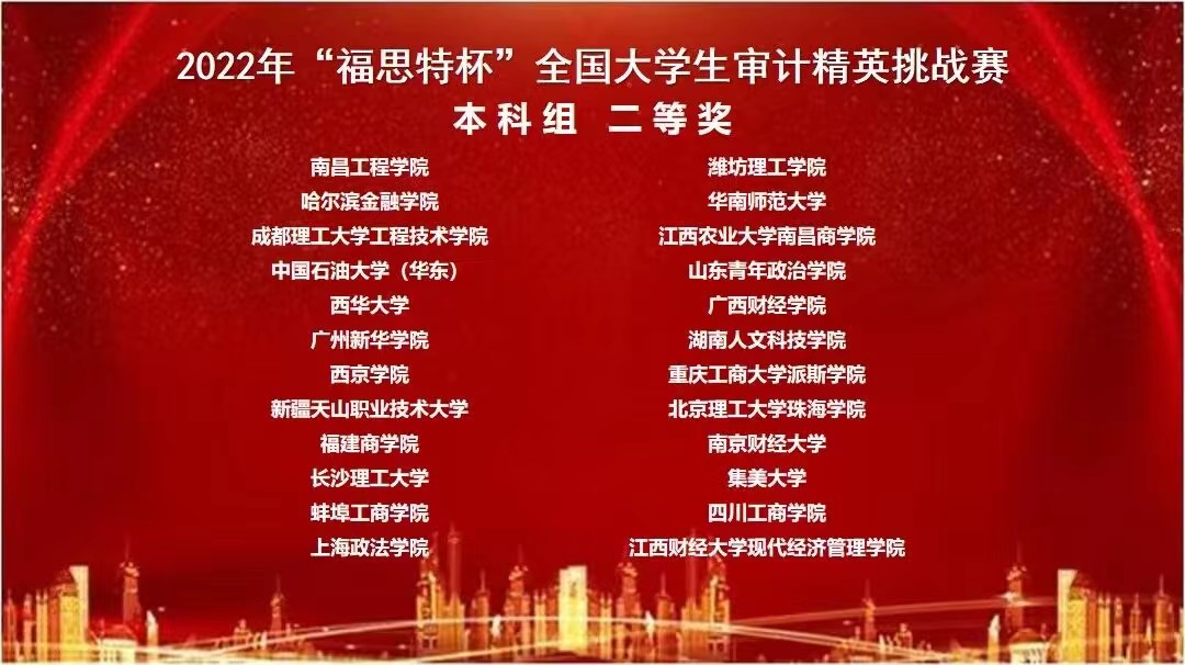 11月26日,由中国审计学会审计教育分会主办的2022年“福思特杯”全国大学生审计精英挑战赛圆满落幕。本次竞赛采用线上比赛形式,共有来自全国三百多所高校的390支队伍参加,其中本科组有252支。我校财务与审计学院的方倩、刘司仪、杨秀玉三名同学组成1支队伍与四川大学、西南财经大学、中南财经政法大学、华南师范大学、西南交通大学、中国石油大学(华东)等985、211学校的251支队伍同台竞技,喜获本科组二等奖。