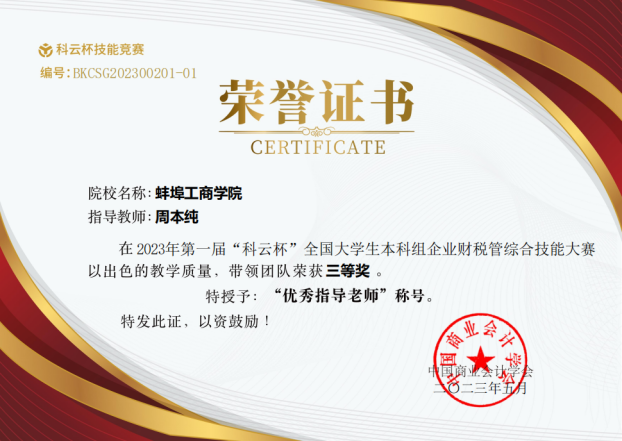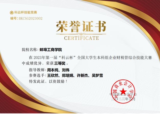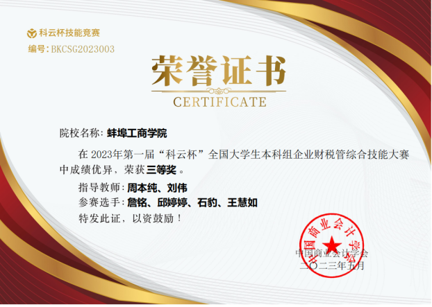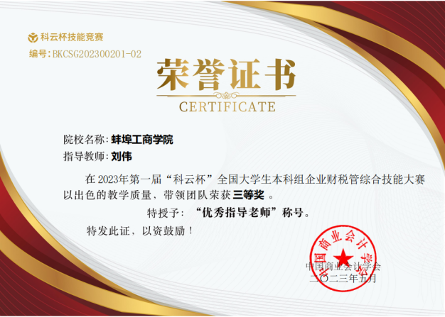 5月25日,2023年“科云杯”全国大学生企业财税管综合技能大赛正式落下帷幕。我校2支队伍均取得全国三等奖的好成绩,周本纯和刘伟老师获得“优秀指导老师”称号。