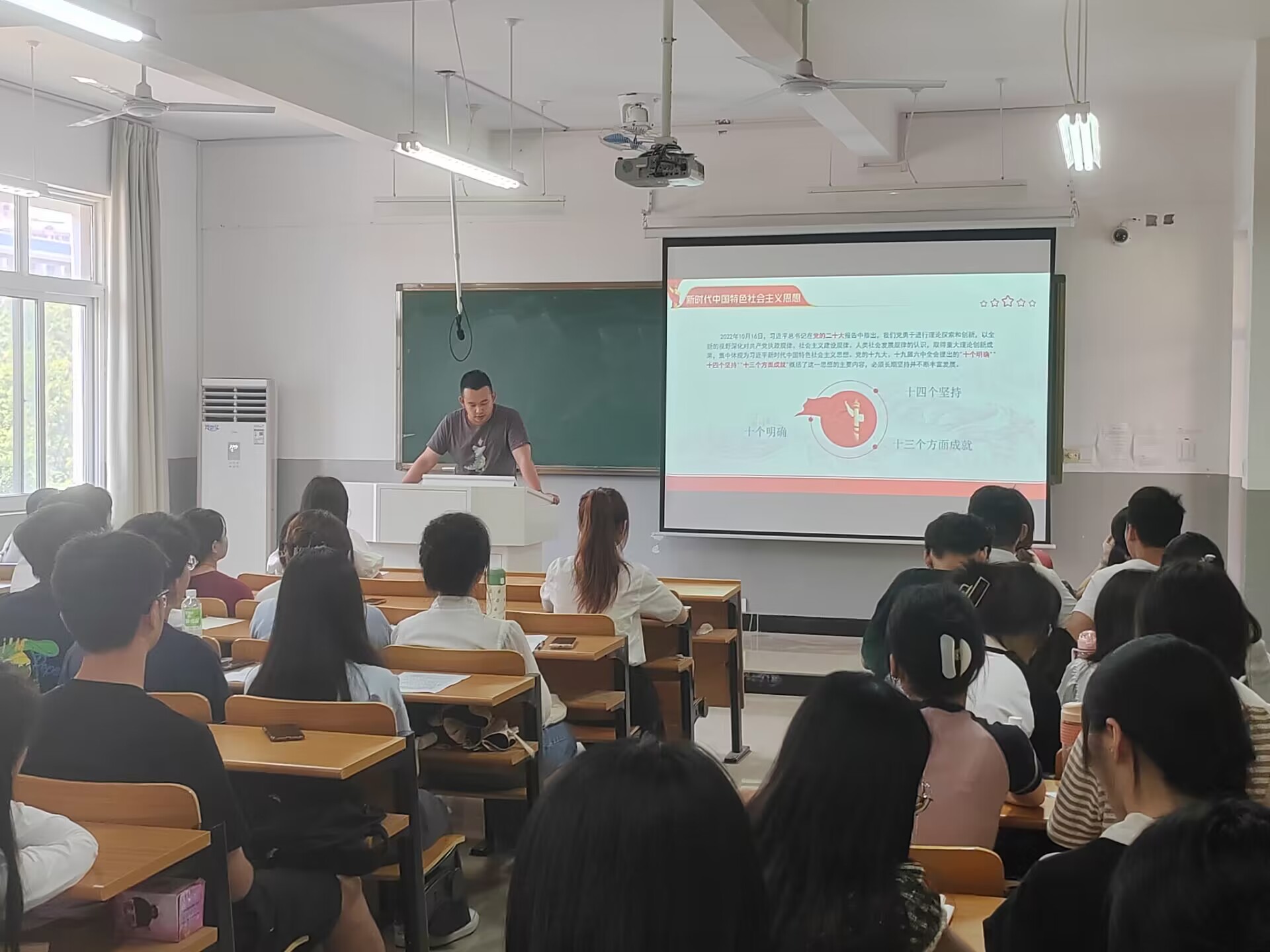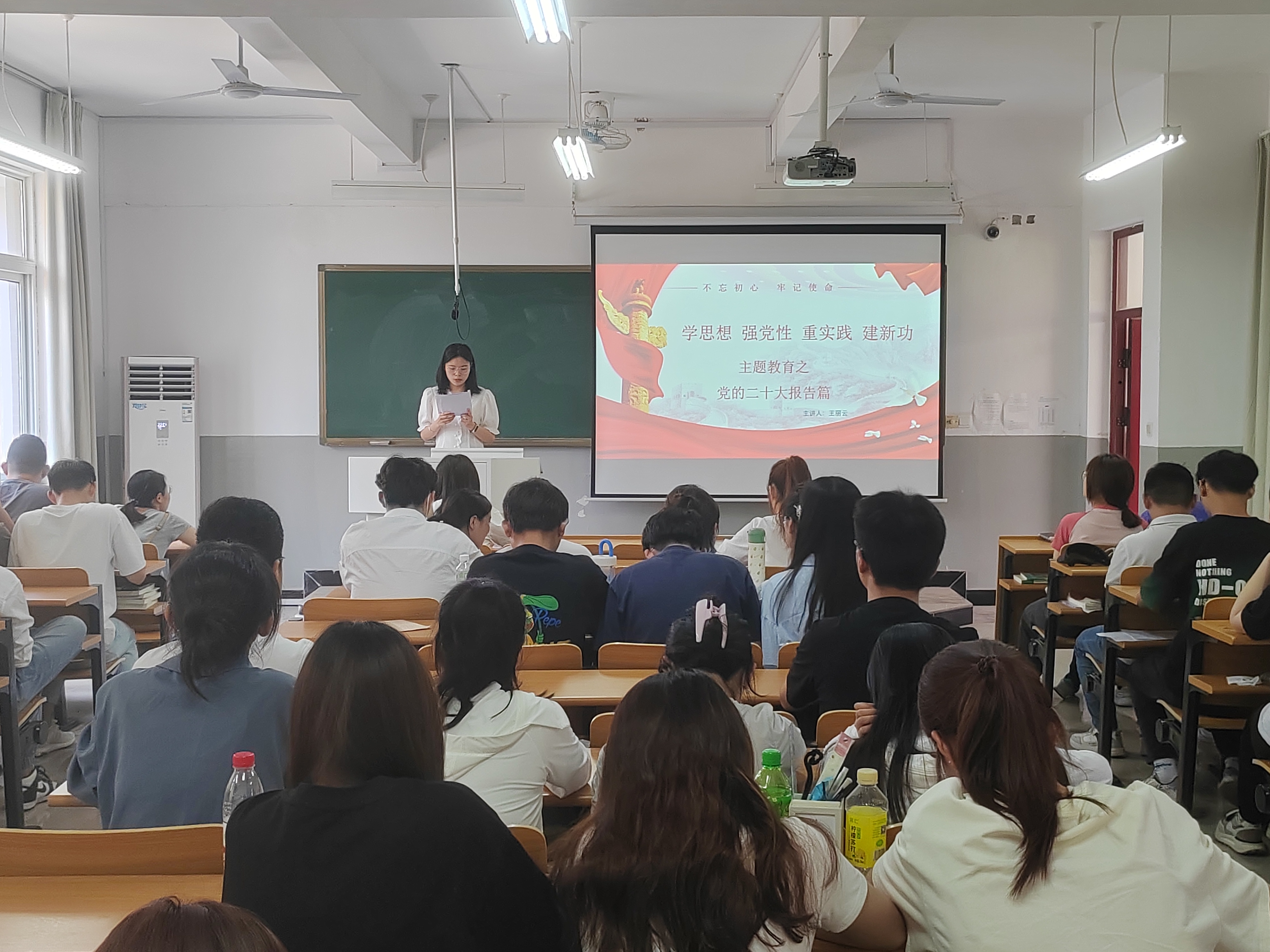 2022年5月31日,财务与审计学院学生第二党支部在明理楼C203展开学习党的二十大报告主题活动,第二党支部书记屈晓龙带领大家一起学习了“习近平新时代中国特色社会主义思想”的主要内容的专题党课。屈晓龙同志希望全体党员要争做“四有”青年,努力成为堪当民族复兴重任的新时代有为青年。