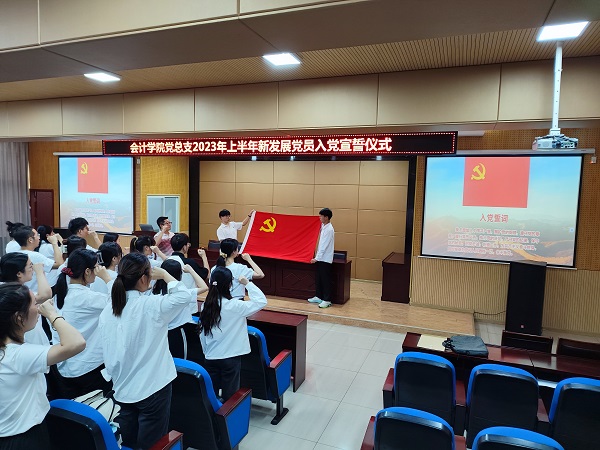 6月21日,会计学院党总支在格物楼B101举办2023年上半年全体新发展党员入党宣誓仪式,会计学院党总支副书记刘根、各学生党支部书记和44名新发展党员出席了此次活动。仪式由会计学院党总支秘书高宇主持。