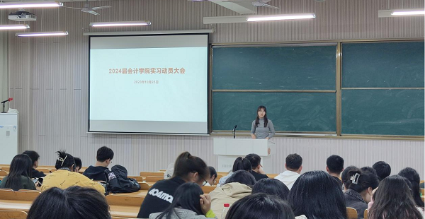 为规范顶岗实习管理,引导学生树立正确就业观,强化安全意识和责任意识,10月25日,会计学院在笃行楼A101召开实习动员大会,会议由学院就业指导老师孙荣主持,全体2024届毕业生参加会议。