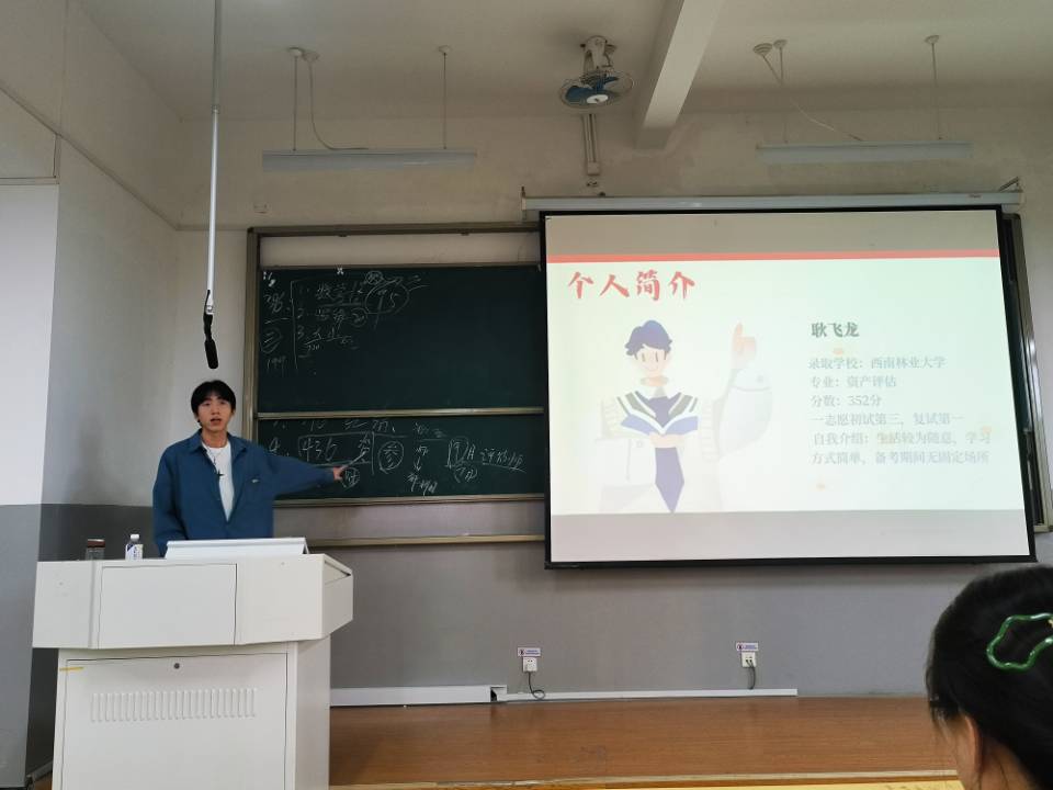 陶伟叶同学从自己的亲身经历出发,讲述了在备考过程中如何制定合理的复习计划,如何高效利用时间,如何调整心态等。她的分享不仅让同学们感受到了考研的艰辛与不易,也为大家提供了实用的备考方法和技巧。
