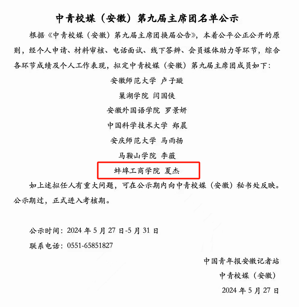 经过现场答辩和会员媒体公投,我院夏杰同学当选成为中青校媒(安徽)第九届主席团成员。在此,我们向夏杰同学表示热烈的祝贺,并期待他在新的岗位上取得更加辉煌的成就。