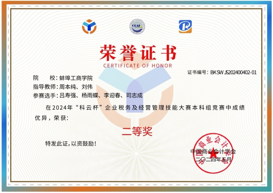 近日,由中国商业会计学会主办,湖南信息学院承办的2024年“科云杯”本科组企业税务及经营管理技能大赛成绩公示。吸引了来自全国300多所高校576支队伍参赛。我院2支代表队凭借卓越的表现,荣获国赛一等奖和二等奖,展现了我院学子在企业税务及经营管理领域的专业实力和竞技水平。