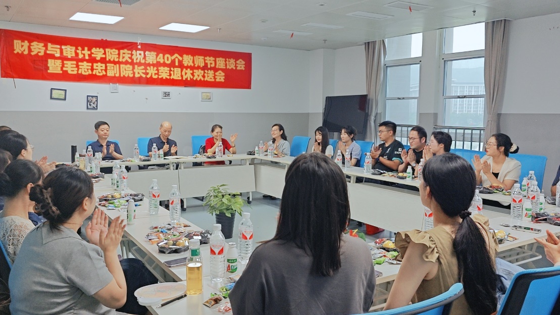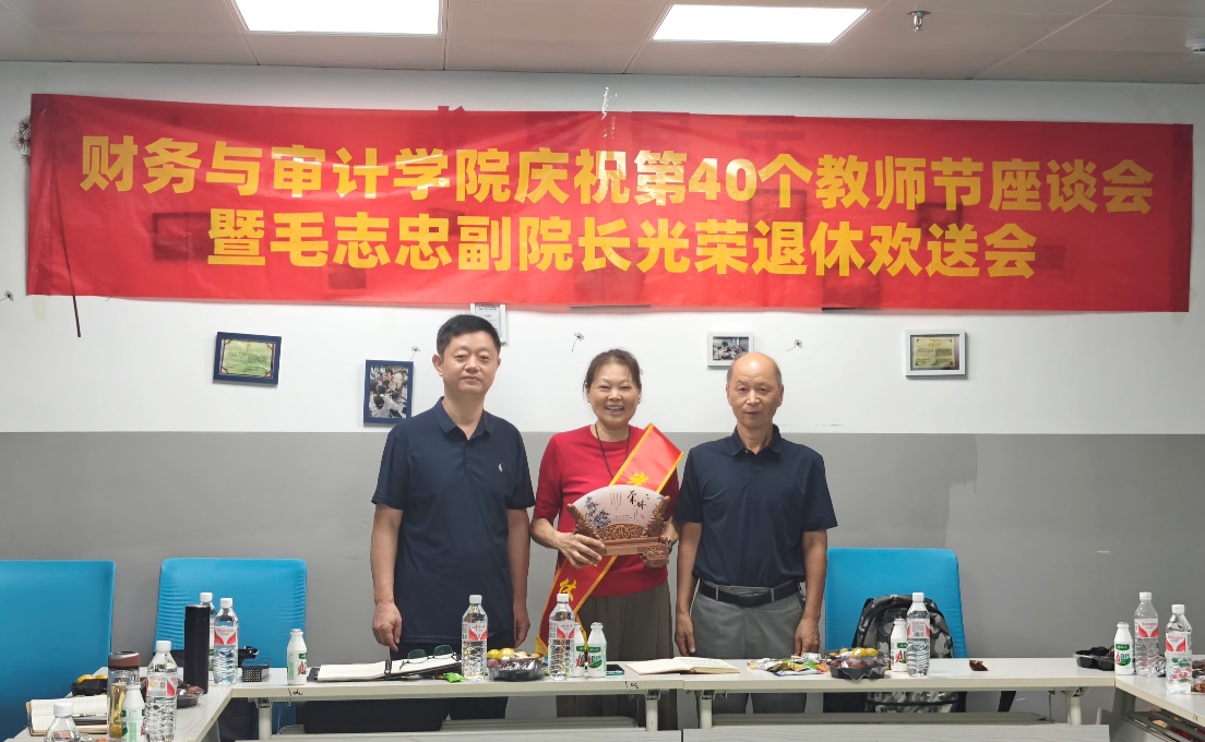 九月的微风轻轻诉说着桃李芬芳满人间的佳话。2024年9月10日,是我国第40个教师节,是一个弘扬教师职业精神、感恩教师辛勤付出的重要节日。财务与审计学院领导及全体教师于2024年9月11日下午在图书馆三楼第1研讨室欢聚一堂,以“大力弘扬教育家精神,加快建设教育强国——春晖涵养,桃李芬芳”为主题,热烈庆祝这个特殊的日子;同时也在这一天为长期致力于教育事业、即将退休的毛院长举办了隆重的退休仪式。活动在温馨而庄重的氛围中圆满落幕,不仅表彰了学院教师们的辛勤耕耘与卓越贡献,也深情致敬了毛志忠副院长多年如一日的忠诚奉献与智慧引领。