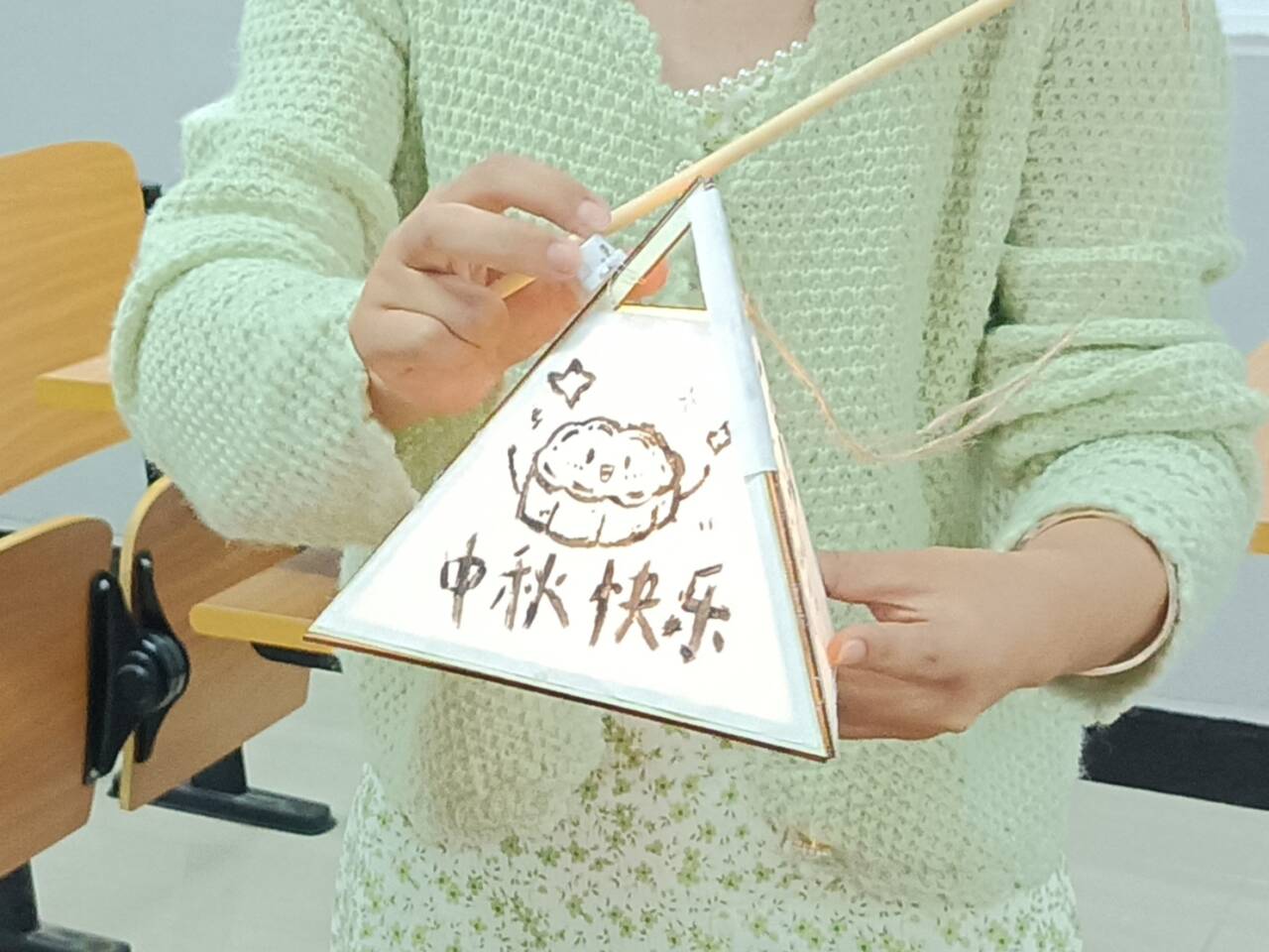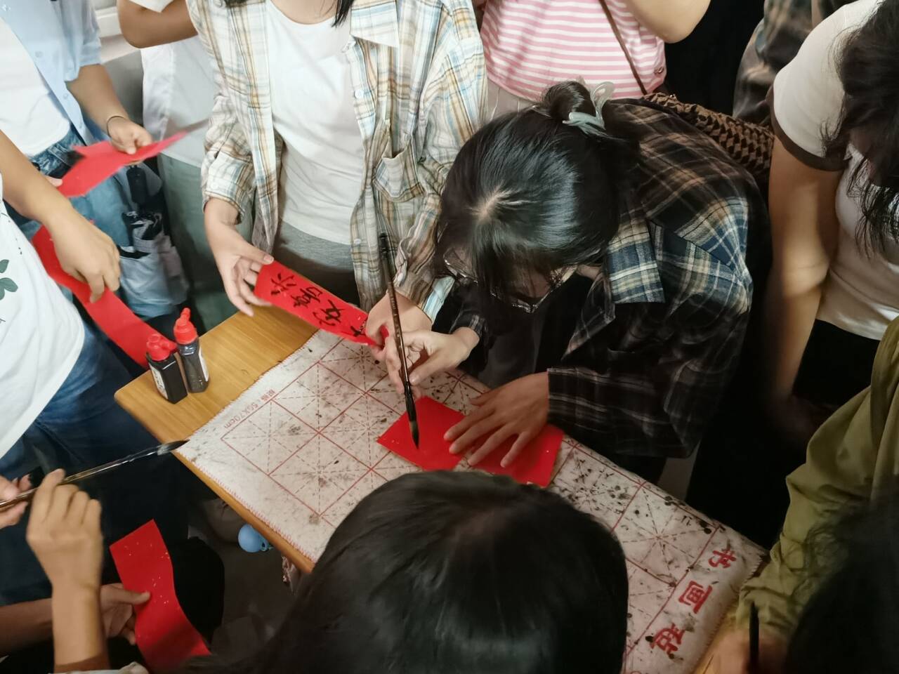 除了猜谜的欢快,还有“笔墨传情”的温情。同学们用毛笔书写下最真挚的祝福,让每一个字都承载着我们对亲朋好友的深情厚意。在柔和的月光下,同学们手持毛笔,沉浸在墨香四溢的氛围中。每一笔、每一划都凝聚着大家的心意与祝福,无论是对家人的思念,还是对朋友的感激,亦或是对未来的美好期许,都通过这一笔一划得以传达。