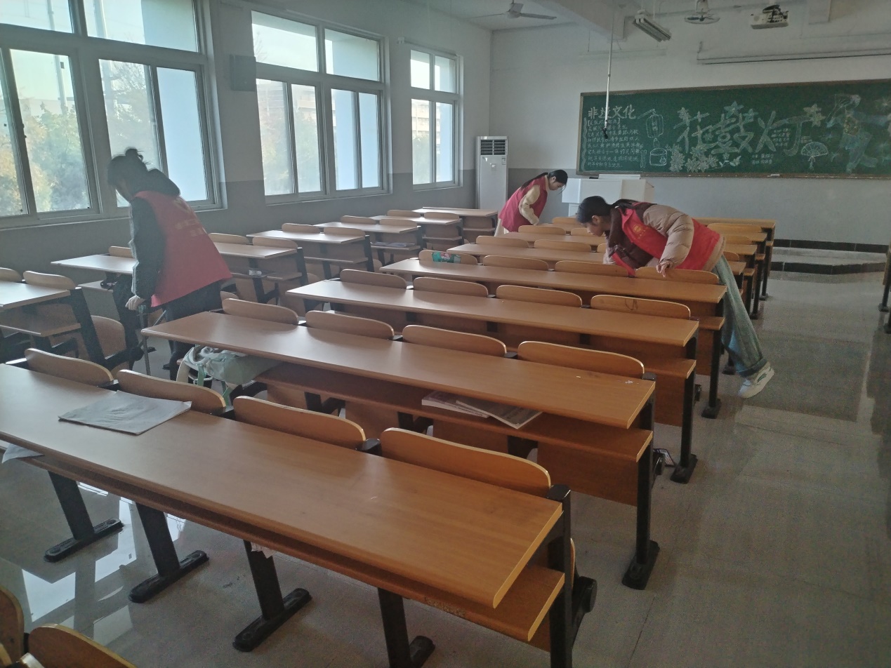 在校内,开展了“洁净教室,你我共创”活动。全体志愿者打扫课桌抽屉里与地面的垃圾,并将黑板擦拭干净,整理讲台。在大家的共同努力下,课桌、黑板、讲台等都变得十分干净,整个教室焕然一新。