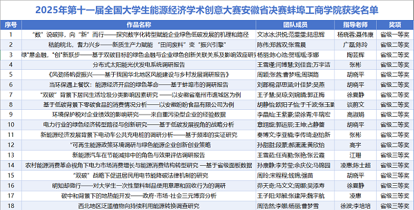 全国学生能源经济学术创意大赛由中国优选法统筹法与经济数学研究会主办,2023年列入《全国普通高校大学生竞赛目录》,是国内能源经济领域规格最高、影响力最广的学术竞赛之一。本届大赛聚焦能源经济转型中的前沿议题,评审团由厦门大学、武汉大学、合肥工业大学、安徽财经大学等12位权威专家组成,从创新性、实践价值、社会效益等维度对作品进行多轮盲审。在与中国科学技术大学、合肥工业大学、安徽大学等双一流高校的激烈竞争中,我校学子凭借跨学科融合与扎实研究脱颖而出。18项获奖作品紧扣双碳战略与乡村振兴,涵盖绿色金融、新能源技术等领域,以多学科交叉、数据驱动为核心,融合产学研实践,凸显了我校新文科建设中跨界融合、服务战略的育人导向。