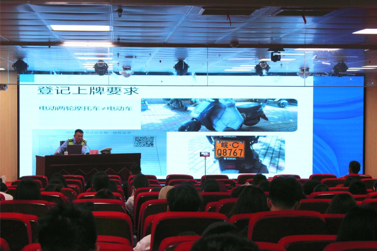 蚌埠市公安局交警支队三大队四中队长王超结合多年的交通管理工作经验,通过真实案例分析、交通法规解读等形式,深入浅出地讲解了交通安全的重要性。他详细介绍了日常出行中需要注意的交通规则,如电瓶车购买及驾驶要求、佩戴安全头盔等,并着重强调了大学校园周边常见的交通隐患以及如何避免交通事故的发生。