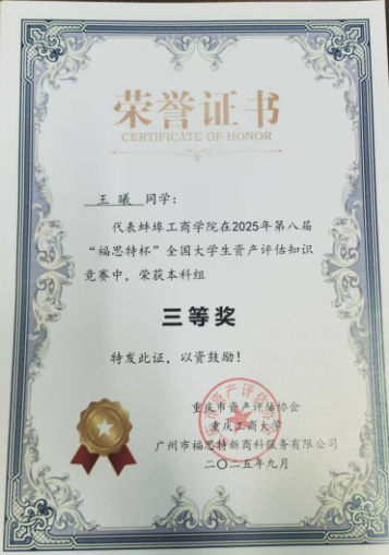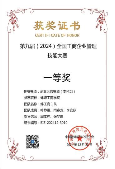 本专业高度重视竞赛育人成效,完善“以赛促学、赛教融合”教学模式,自建院级特色赛事8项,涵盖资产评估、生态环境、创业模拟等多个领域。近三年,学生累计获得省级及以上赛事奖项20余项,其中包括2024年iCAN大学生创新创业大赛“精创杯”数字经济决策创新挑战赛全国总决赛一等奖、2025年iCAN大学生创新创业大赛“鼎堂杯”数字化创业经营模拟挑战赛全国总决赛一等奖、2025年第十九届iCAN大学生创新创业大赛(安徽赛区)二等奖、2025年安徽省大学生生态环境创新创业大赛二等奖、2025年第八届“福斯特杯”全国大学生资产评估知识竞赛三等奖、全国第三届高校数智化商业决策创新大赛本科组二等奖、第九届全国工商企业管理技能大赛一等奖等奖项。