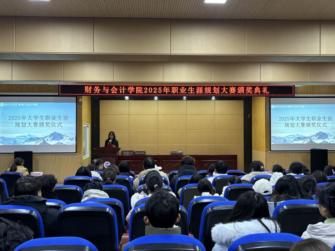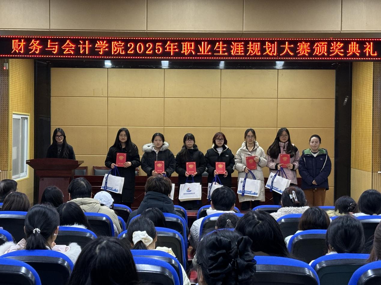 为加强学生职业生涯规划意识,引导学生明确职业发展方向,2026年1月4日,财务与会计学院于格物楼B101举行2025年职业生涯规划大赛颁奖典礼。学院党总支书记孟北平、就业工作人员朱雯婷老师、孙荣老师及2025级学生代表共同出席本次活动。