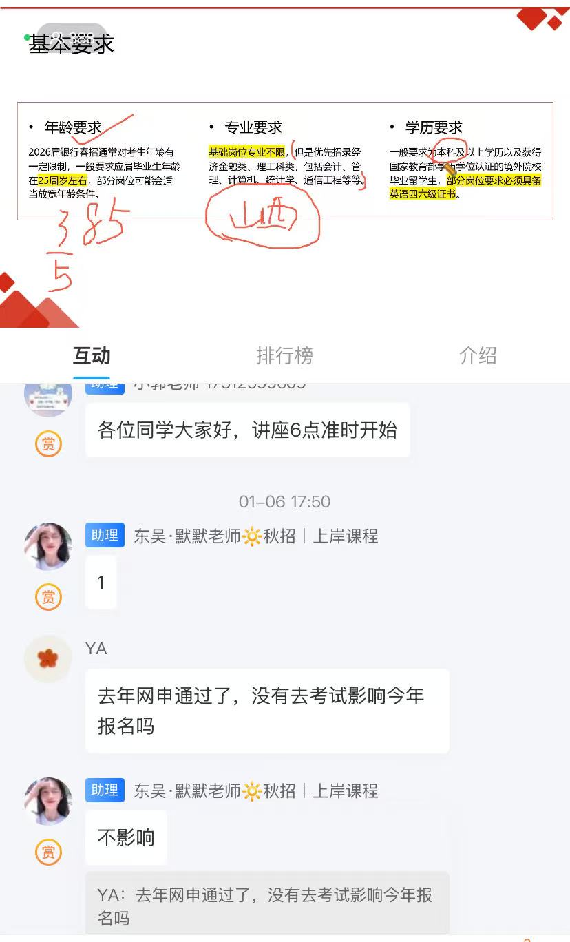 讲座于16日(周二)18:00通过线上平台进行,面向学院未就业的大四学生开放。王老师结合往年春招情况与当前就业形势,深入剖析了各大银行的招聘流程与备考策略,并为学生提供了针对性强的复习建议与资源推荐。同学们积极参与互动,就关心的问题进行了线上咨询,现场气氛热烈。